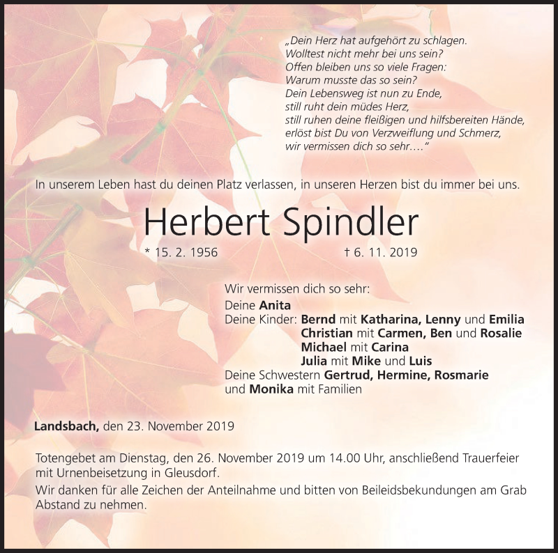 Hier finden Sie alle Traueranzeigen aus der Zeitung, die bisher für Herbert Spindler erschienen sind. Weitere Traueranzeigen, die in der Zeitung erscheinen, werden hier ebenfalls aufgelistet
