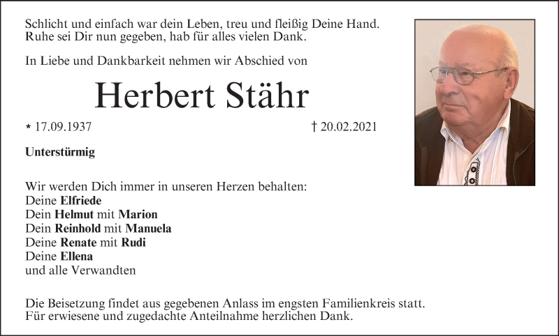Hier finden Sie alle Traueranzeigen aus der Zeitung, die bisher für Herbert Stähr erschienen sind. Weitere Traueranzeigen, die in der Zeitung erscheinen, werden hier ebenfalls aufgelistet
