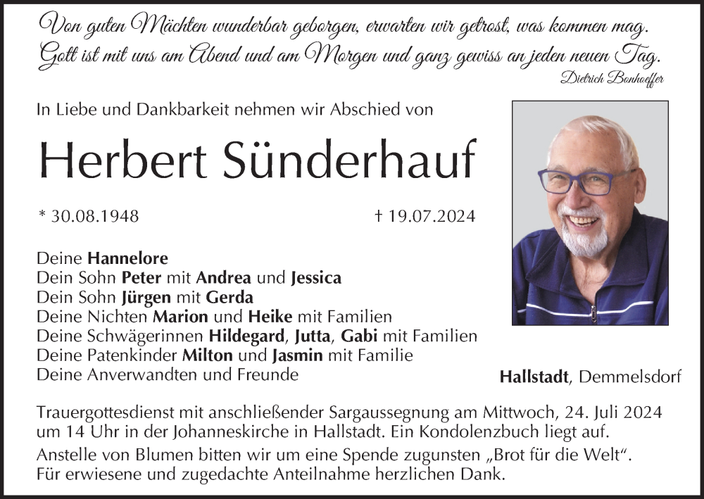 Hier finden Sie alle Traueranzeigen aus der Zeitung, die bisher für Herbert Sünderhauf erschienen sind. Weitere Traueranzeigen, die in der Zeitung erscheinen, werden hier ebenfalls aufgelistet