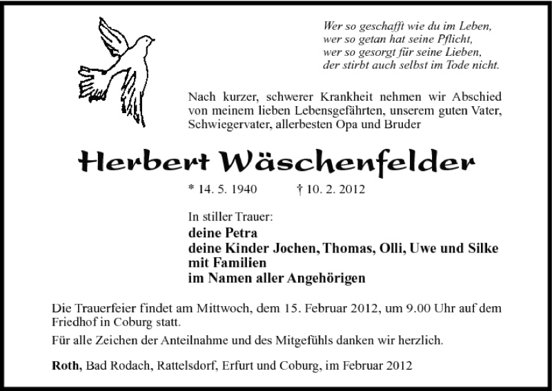 Hier finden Sie alle Traueranzeigen aus der Zeitung, die bisher für Herbert Wäschenfelder erschienen sind. Weitere Traueranzeigen, die in der Zeitung erscheinen, werden hier ebenfalls aufgelistet