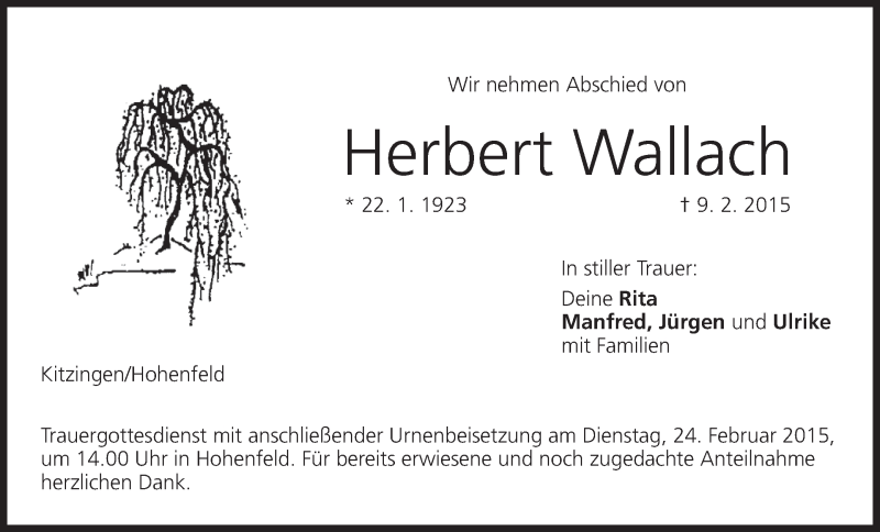 Hier finden Sie alle Traueranzeigen aus der Zeitung, die bisher für Herbert Wallach erschienen sind. Weitere Traueranzeigen, die in der Zeitung erscheinen, werden hier ebenfalls aufgelistet