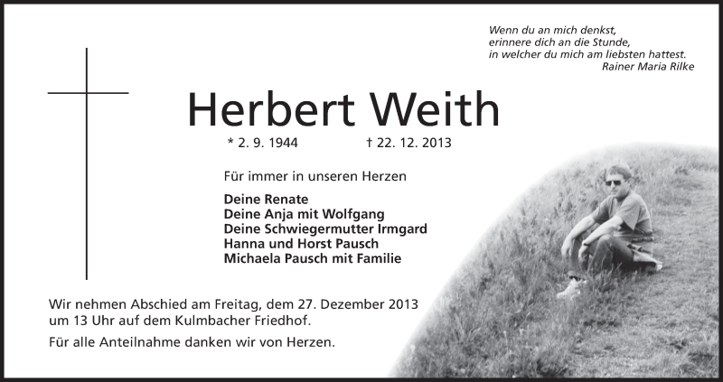 Hier finden Sie alle Traueranzeigen aus der Zeitung, die bisher für Herbert Weith erschienen sind. Weitere Traueranzeigen, die in der Zeitung erscheinen, werden hier ebenfalls aufgelistet