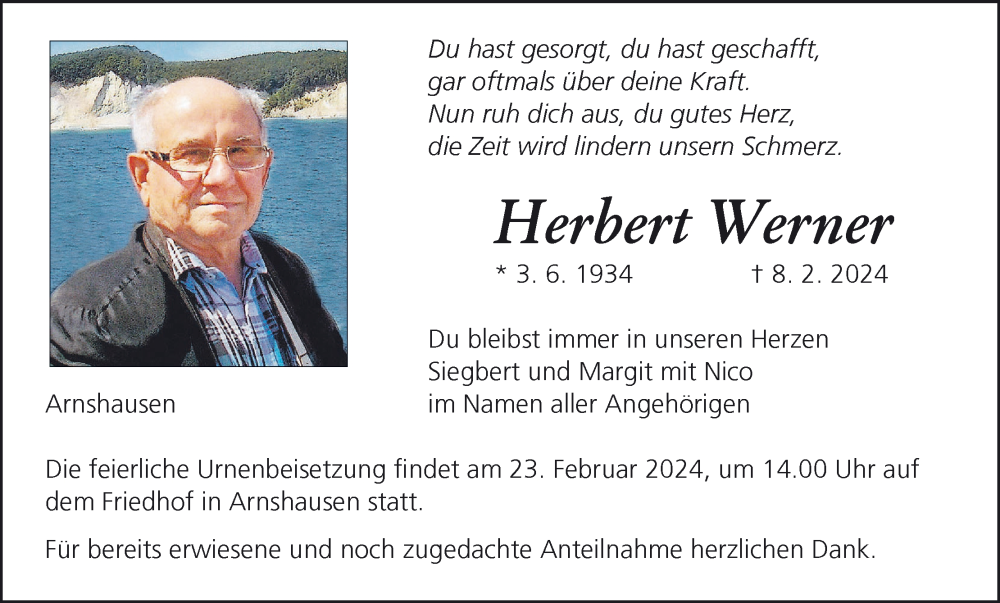 Hier finden Sie alle Traueranzeigen aus der Zeitung, die bisher für Herbert Werner erschienen sind. Weitere Traueranzeigen, die in der Zeitung erscheinen, werden hier ebenfalls aufgelistet