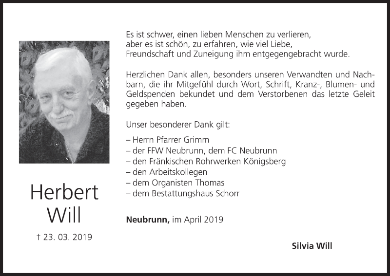 Hier finden Sie alle Traueranzeigen aus der Zeitung, die bisher für Herbert Will erschienen sind. Weitere Traueranzeigen, die in der Zeitung erscheinen, werden hier ebenfalls aufgelistet