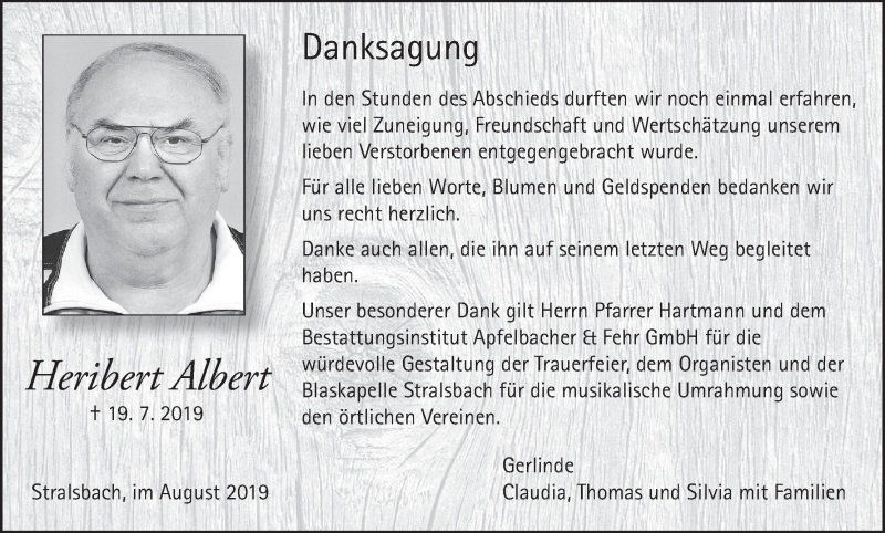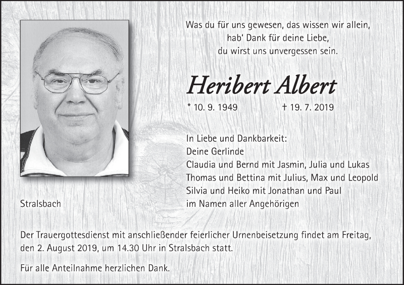 Hier finden Sie alle Traueranzeigen aus der Zeitung, die bisher für Heribert Albert erschienen sind. Weitere Traueranzeigen, die in der Zeitung erscheinen, werden hier ebenfalls aufgelistet