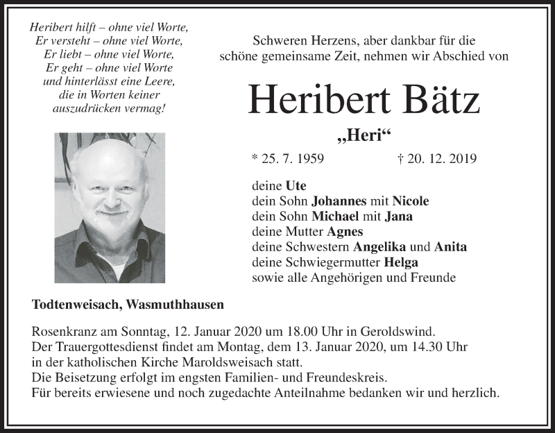 Hier finden Sie alle Traueranzeigen aus der Zeitung, die bisher für Heribert Bätz erschienen sind. Weitere Traueranzeigen, die in der Zeitung erscheinen, werden hier ebenfalls aufgelistet