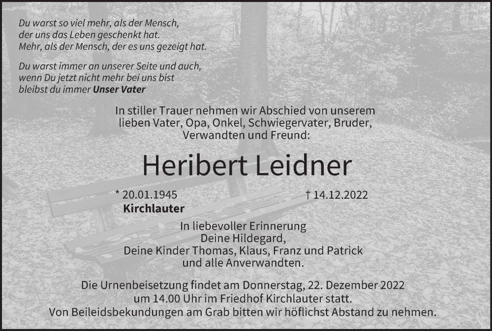 Hier finden Sie alle Traueranzeigen aus der Zeitung, die bisher für Heribert Leidner erschienen sind. Weitere Traueranzeigen, die in der Zeitung erscheinen, werden hier ebenfalls aufgelistet