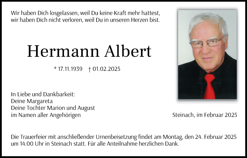 Hier finden Sie alle Traueranzeigen aus der Zeitung, die bisher für Hermann Albert erschienen sind. Weitere Traueranzeigen, die in der Zeitung erscheinen, werden hier ebenfalls aufgelistet