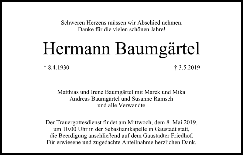 Hier finden Sie alle Traueranzeigen aus der Zeitung, die bisher für Hermann Baumgärtel erschienen sind. Weitere Traueranzeigen, die in der Zeitung erscheinen, werden hier ebenfalls aufgelistet