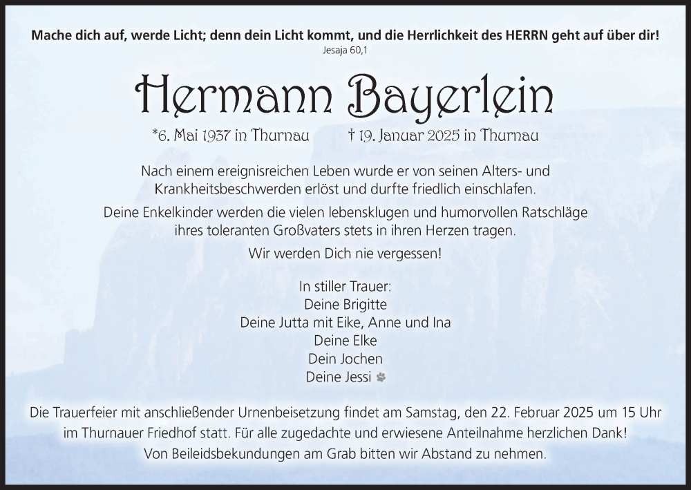 Hier finden Sie alle Traueranzeigen aus der Zeitung, die bisher für Hermann Bayerlein erschienen sind. Weitere Traueranzeigen, die in der Zeitung erscheinen, werden hier ebenfalls aufgelistet