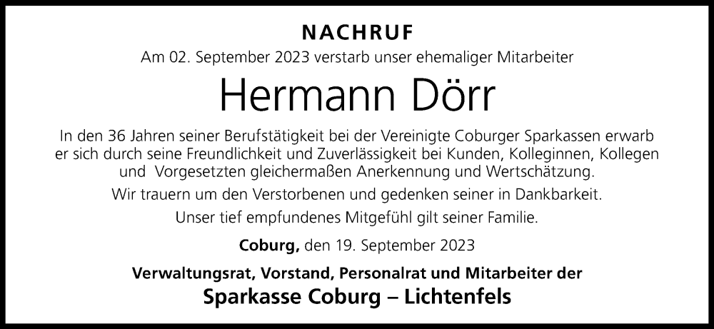 Hier finden Sie alle Traueranzeigen aus der Zeitung, die bisher für Hermann Dörr erschienen sind. Weitere Traueranzeigen, die in der Zeitung erscheinen, werden hier ebenfalls aufgelistet