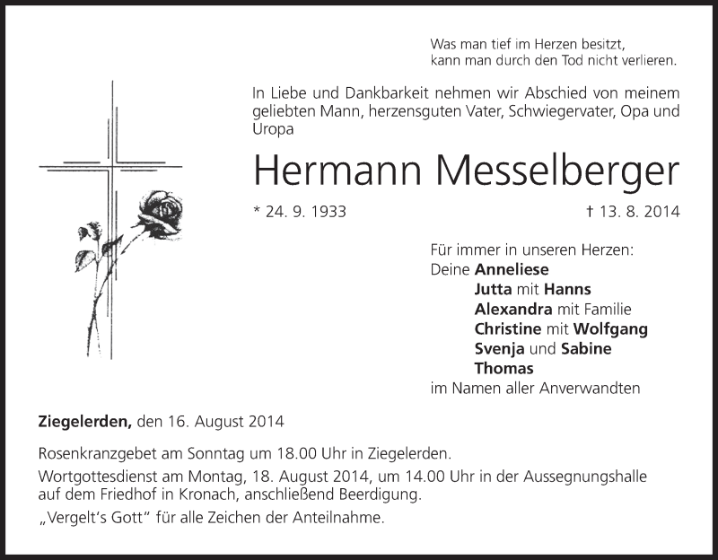 Hier finden Sie alle Traueranzeigen aus der Zeitung, die bisher für Hermann Messelberger erschienen sind. Weitere Traueranzeigen, die in der Zeitung erscheinen, werden hier ebenfalls aufgelistet