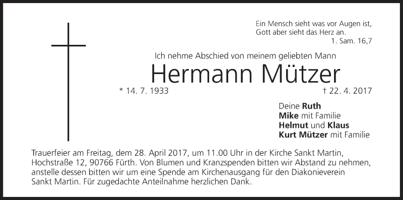 Hier finden Sie alle Traueranzeigen aus der Zeitung, die bisher für Hermann Mützer erschienen sind. Weitere Traueranzeigen, die in der Zeitung erscheinen, werden hier ebenfalls aufgelistet