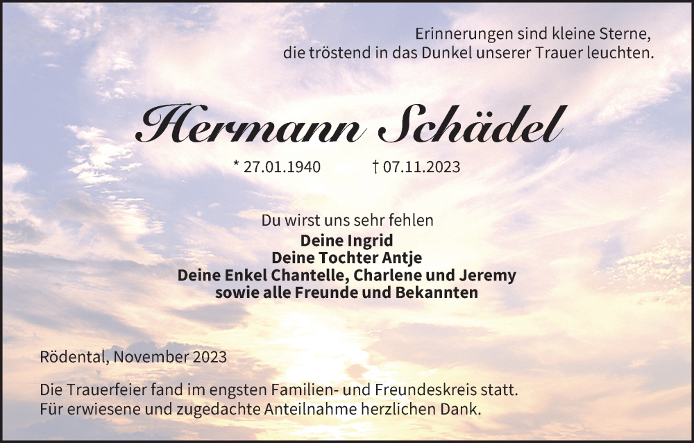 Hier finden Sie alle Traueranzeigen aus der Zeitung, die bisher für Hermann Schädel erschienen sind. Weitere Traueranzeigen, die in der Zeitung erscheinen, werden hier ebenfalls aufgelistet