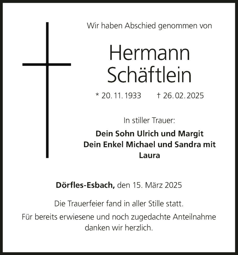 Hier finden Sie alle Traueranzeigen aus der Zeitung, die bisher für Hermann Schäftlein erschienen sind. Weitere Traueranzeigen, die in der Zeitung erscheinen, werden hier ebenfalls aufgelistet