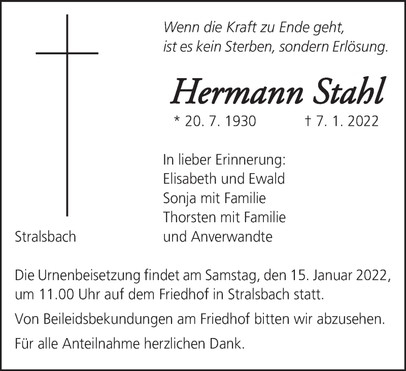 Hier finden Sie alle Traueranzeigen aus der Zeitung, die bisher für Hermann Stahl erschienen sind. Weitere Traueranzeigen, die in der Zeitung erscheinen, werden hier ebenfalls aufgelistet