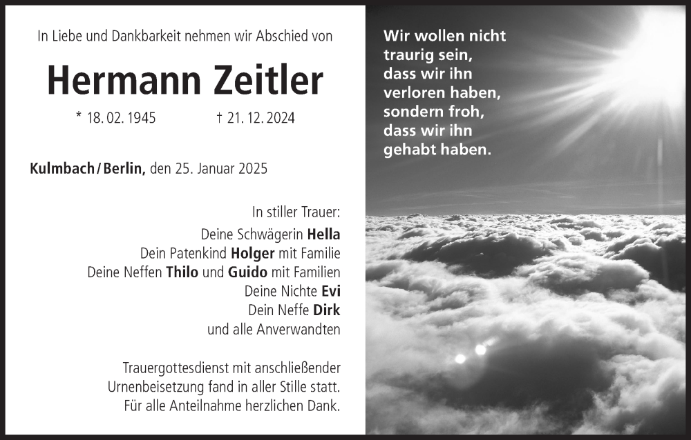 Hier finden Sie alle Traueranzeigen aus der Zeitung, die bisher für Hermann Zeitler erschienen sind. Weitere Traueranzeigen, die in der Zeitung erscheinen, werden hier ebenfalls aufgelistet