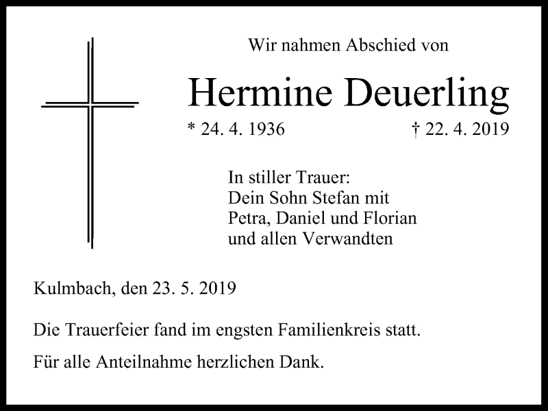Hier finden Sie alle Traueranzeigen aus der Zeitung, die bisher für Hermine Deuerling erschienen sind. Weitere Traueranzeigen, die in der Zeitung erscheinen, werden hier ebenfalls aufgelistet
