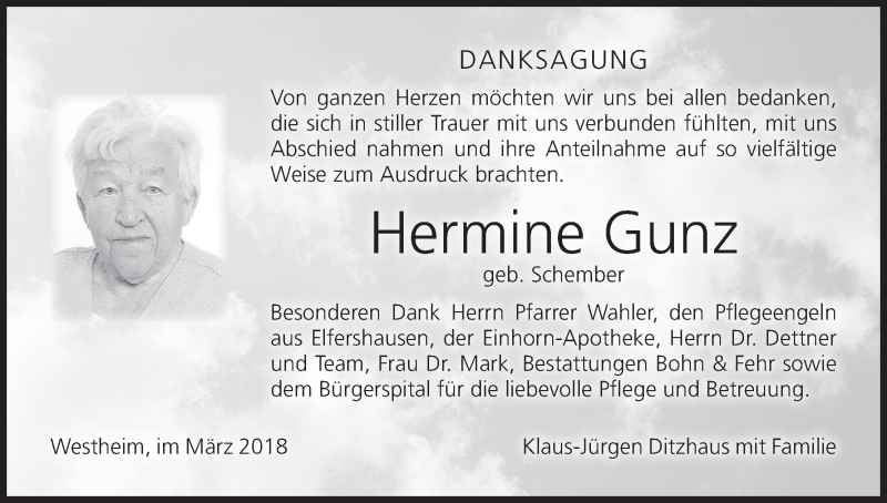 Hier finden Sie alle Traueranzeigen aus der Zeitung, die bisher für Hermine Gunz erschienen sind. Weitere Traueranzeigen, die in der Zeitung erscheinen, werden hier ebenfalls aufgelistet