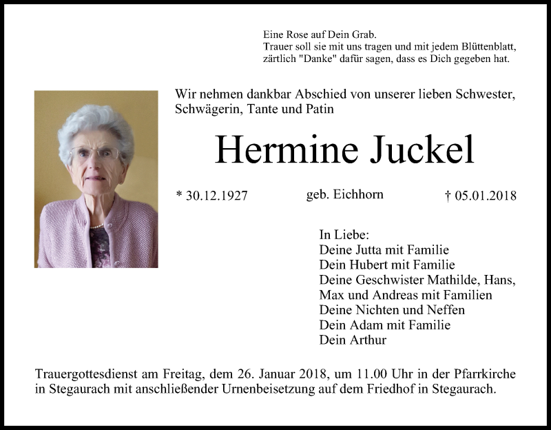 Hier finden Sie alle Traueranzeigen aus der Zeitung, die bisher für Hermine Juckel erschienen sind. Weitere Traueranzeigen, die in der Zeitung erscheinen, werden hier ebenfalls aufgelistet