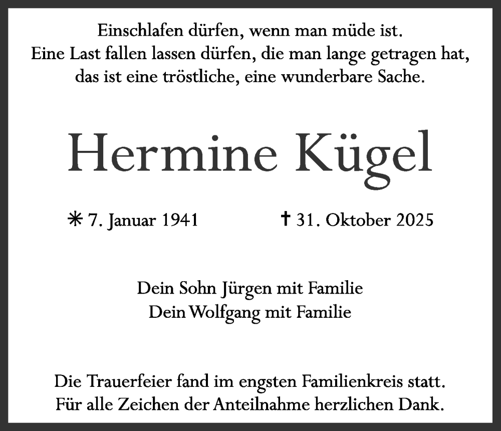 Hier finden Sie alle Traueranzeigen aus der Zeitung, die bisher für Hermine Kügel erschienen sind. Weitere Traueranzeigen, die in der Zeitung erscheinen, werden hier ebenfalls aufgelistet