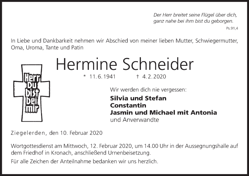 Hier finden Sie alle Traueranzeigen aus der Zeitung, die bisher für Hermine Schneider erschienen sind. Weitere Traueranzeigen, die in der Zeitung erscheinen, werden hier ebenfalls aufgelistet