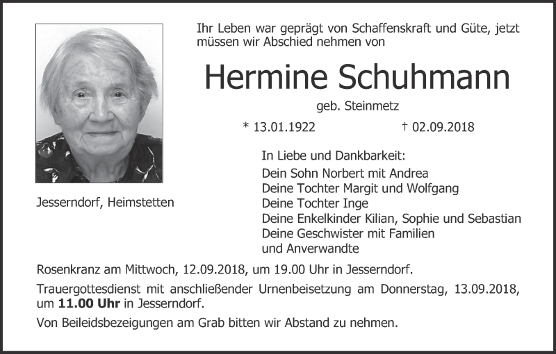 Hier finden Sie alle Traueranzeigen aus der Zeitung, die bisher für Hermine Schuhmann erschienen sind. Weitere Traueranzeigen, die in der Zeitung erscheinen, werden hier ebenfalls aufgelistet