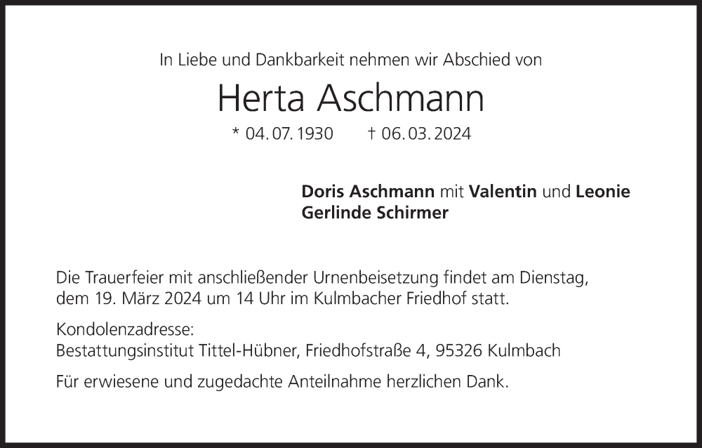 Hier finden Sie alle Traueranzeigen aus der Zeitung, die bisher für Herta Aschmann erschienen sind. Weitere Traueranzeigen, die in der Zeitung erscheinen, werden hier ebenfalls aufgelistet