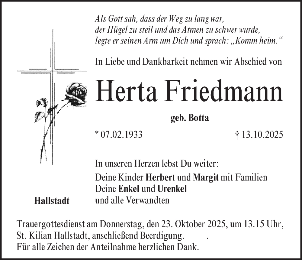 Hier finden Sie alle Traueranzeigen aus der Zeitung, die bisher für Herta Friedmann erschienen sind. Weitere Traueranzeigen, die in der Zeitung erscheinen, werden hier ebenfalls aufgelistet