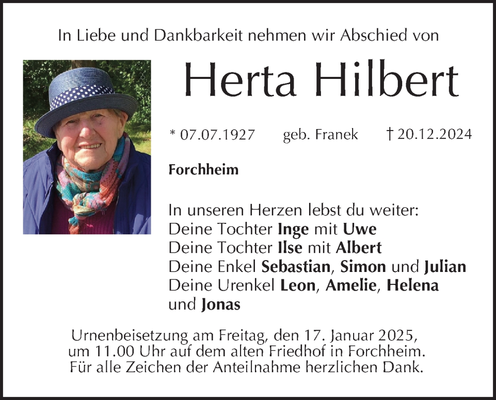 Hier finden Sie alle Traueranzeigen aus der Zeitung, die bisher für Herta Hilbert erschienen sind. Weitere Traueranzeigen, die in der Zeitung erscheinen, werden hier ebenfalls aufgelistet