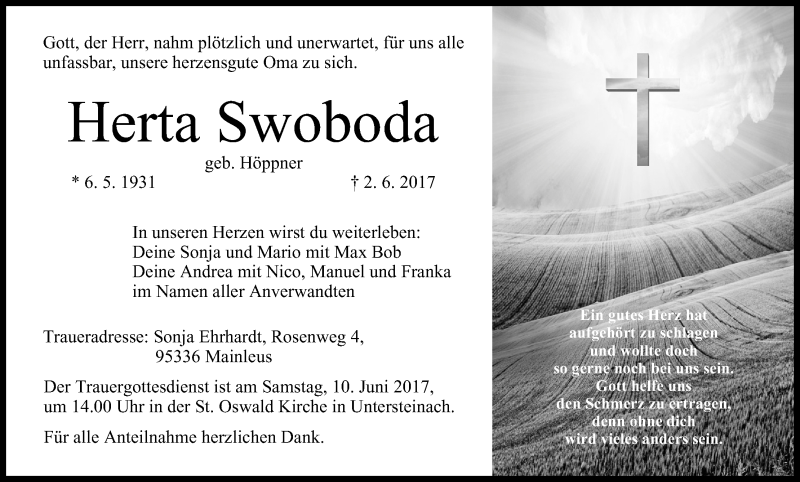 Hier finden Sie alle Traueranzeigen aus der Zeitung, die bisher für Herta Swoboda erschienen sind. Weitere Traueranzeigen, die in der Zeitung erscheinen, werden hier ebenfalls aufgelistet