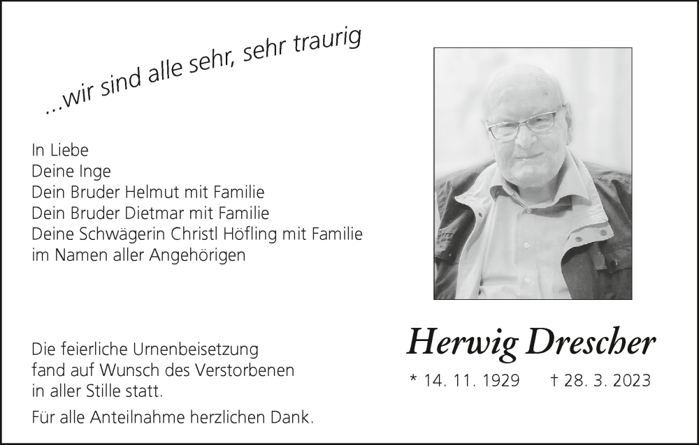 Hier finden Sie alle Traueranzeigen aus der Zeitung, die bisher für Herwig Drescher erschienen sind. Weitere Traueranzeigen, die in der Zeitung erscheinen, werden hier ebenfalls aufgelistet