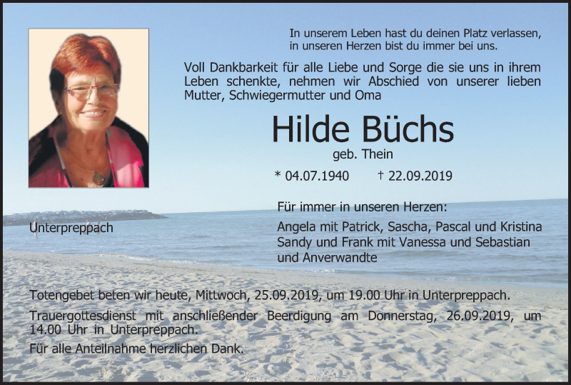 Hier finden Sie alle Traueranzeigen aus der Zeitung, die bisher für Hilde Büchs erschienen sind. Weitere Traueranzeigen, die in der Zeitung erscheinen, werden hier ebenfalls aufgelistet