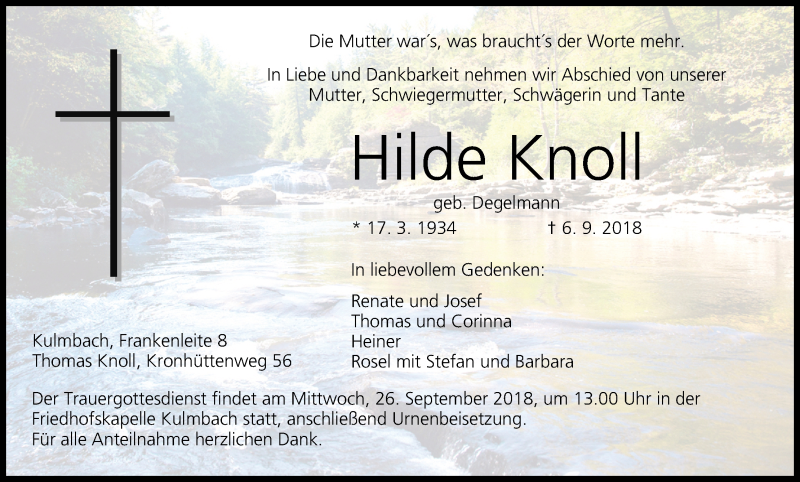Hier finden Sie alle Traueranzeigen aus der Zeitung, die bisher für Hilde Knoll erschienen sind. Weitere Traueranzeigen, die in der Zeitung erscheinen, werden hier ebenfalls aufgelistet