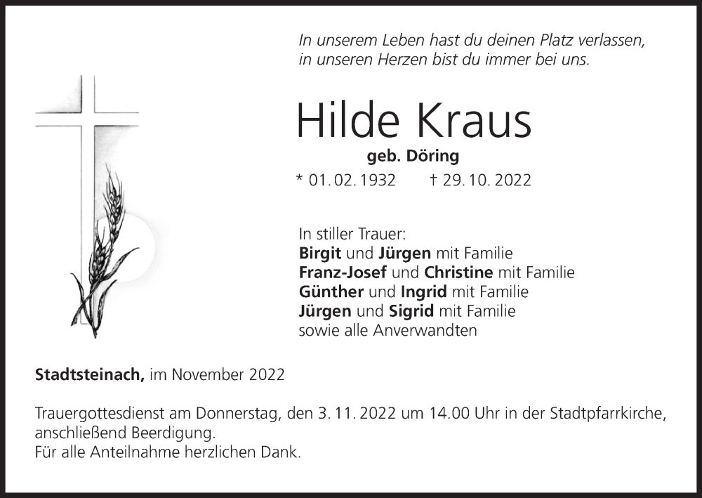 Hier finden Sie alle Traueranzeigen aus der Zeitung, die bisher für Hilde Kraus erschienen sind. Weitere Traueranzeigen, die in der Zeitung erscheinen, werden hier ebenfalls aufgelistet