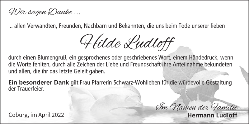 Hier finden Sie alle Traueranzeigen aus der Zeitung, die bisher für Hilde Ludloff erschienen sind. Weitere Traueranzeigen, die in der Zeitung erscheinen, werden hier ebenfalls aufgelistet