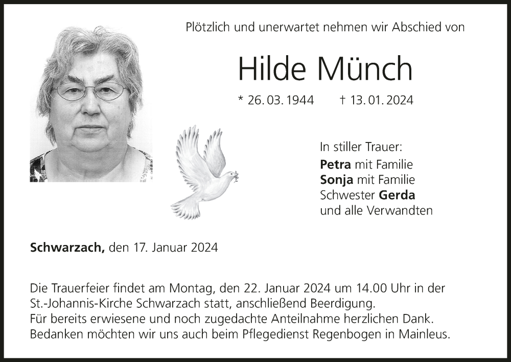 Hier finden Sie alle Traueranzeigen aus der Zeitung, die bisher für Hilde Münch erschienen sind. Weitere Traueranzeigen, die in der Zeitung erscheinen, werden hier ebenfalls aufgelistet