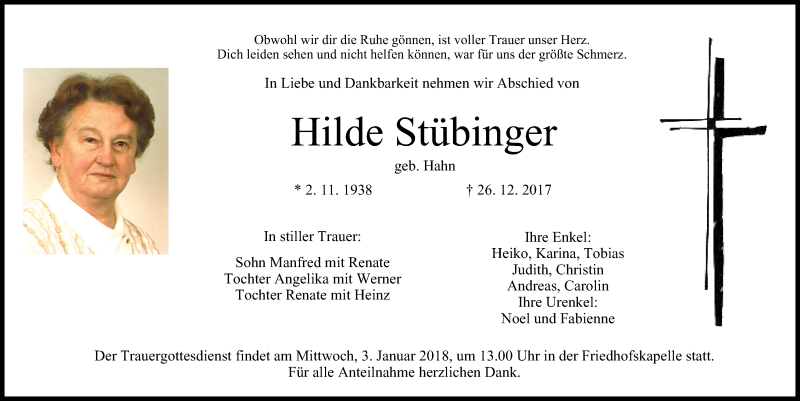 Hier finden Sie alle Traueranzeigen aus der Zeitung, die bisher für Hilde Sübinger erschienen sind. Weitere Traueranzeigen, die in der Zeitung erscheinen, werden hier ebenfalls aufgelistet