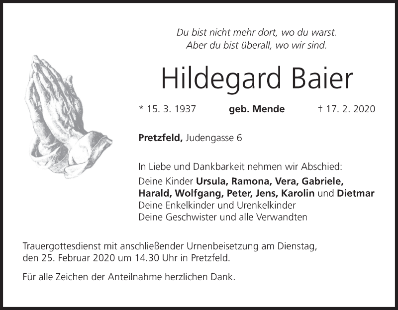 Hier finden Sie alle Traueranzeigen aus der Zeitung, die bisher für Hildegard Baier erschienen sind. Weitere Traueranzeigen, die in der Zeitung erscheinen, werden hier ebenfalls aufgelistet