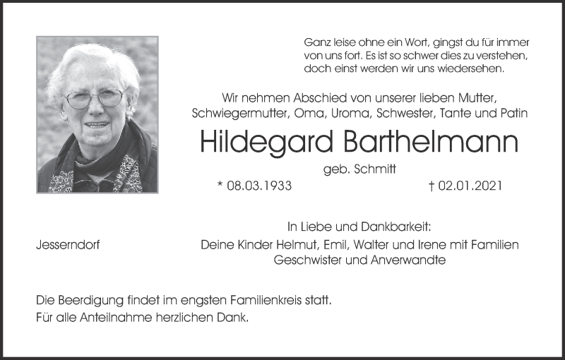 Hier finden Sie alle Traueranzeigen aus der Zeitung, die bisher für Hildegard Barthelmann erschienen sind. Weitere Traueranzeigen, die in der Zeitung erscheinen, werden hier ebenfalls aufgelistet