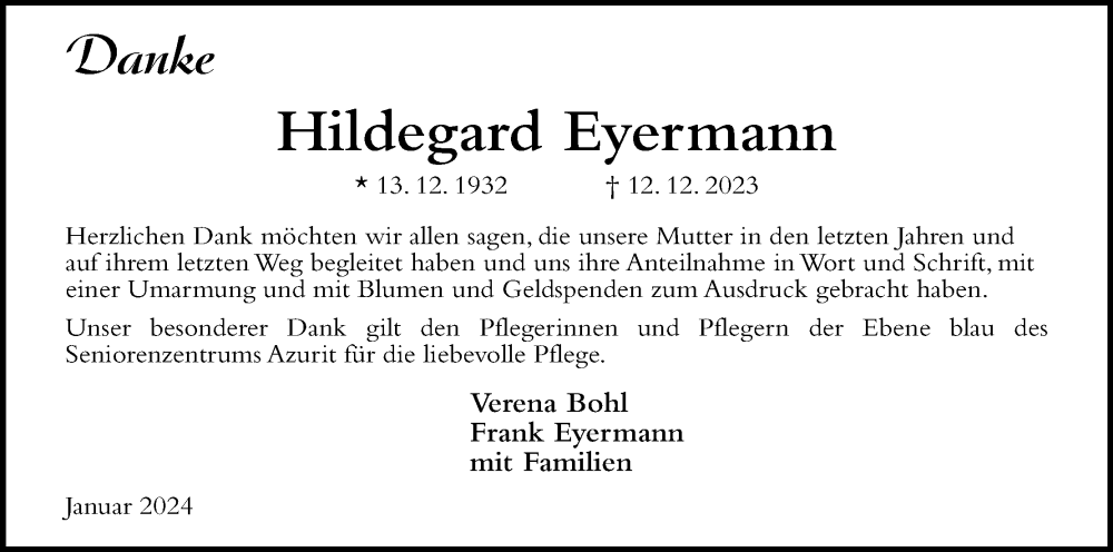 Hier finden Sie alle Traueranzeigen aus der Zeitung, die bisher für Hildegard Eyermann erschienen sind. Weitere Traueranzeigen, die in der Zeitung erscheinen, werden hier ebenfalls aufgelistet