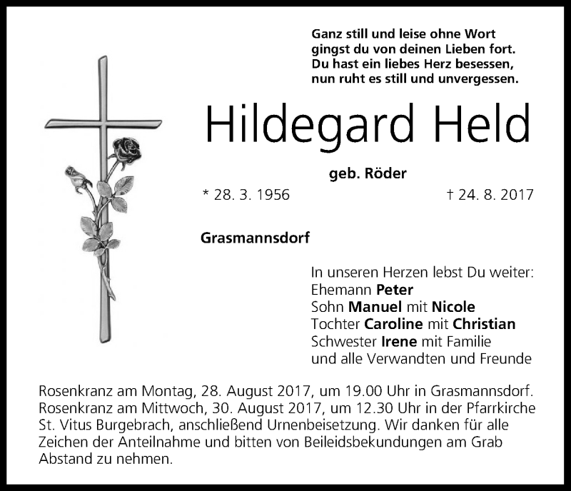 Hier finden Sie alle Traueranzeigen aus der Zeitung, die bisher für Hildegard Held erschienen sind. Weitere Traueranzeigen, die in der Zeitung erscheinen, werden hier ebenfalls aufgelistet