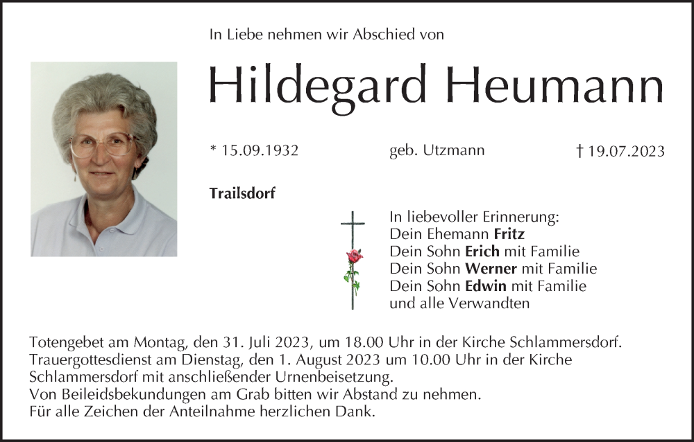 Hier finden Sie alle Traueranzeigen aus der Zeitung, die bisher für Hildegard Heumann erschienen sind. Weitere Traueranzeigen, die in der Zeitung erscheinen, werden hier ebenfalls aufgelistet