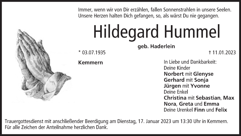 Hier finden Sie alle Traueranzeigen aus der Zeitung, die bisher für Hildegard Hummel erschienen sind. Weitere Traueranzeigen, die in der Zeitung erscheinen, werden hier ebenfalls aufgelistet