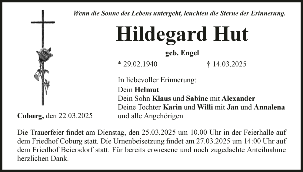 Hier finden Sie alle Traueranzeigen aus der Zeitung, die bisher für Hildegard Hut erschienen sind. Weitere Traueranzeigen, die in der Zeitung erscheinen, werden hier ebenfalls aufgelistet