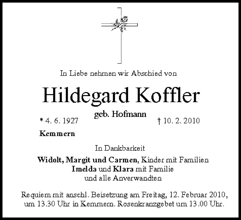 Hier finden Sie alle Traueranzeigen aus der Zeitung, die bisher für Hildegard Koffler erschienen sind. Weitere Traueranzeigen, die in der Zeitung erscheinen, werden hier ebenfalls aufgelistet