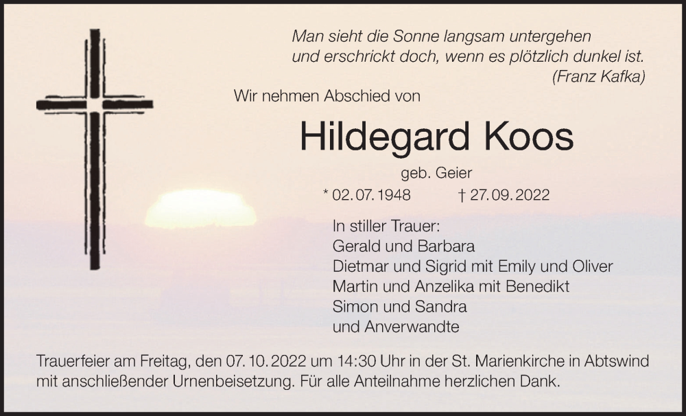 Hier finden Sie alle Traueranzeigen aus der Zeitung, die bisher für Hildegard Koos erschienen sind. Weitere Traueranzeigen, die in der Zeitung erscheinen, werden hier ebenfalls aufgelistet