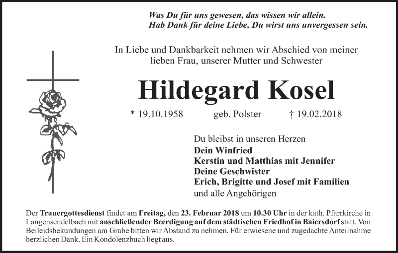 Hier finden Sie alle Traueranzeigen aus der Zeitung, die bisher für Hildegard Kosel erschienen sind. Weitere Traueranzeigen, die in der Zeitung erscheinen, werden hier ebenfalls aufgelistet