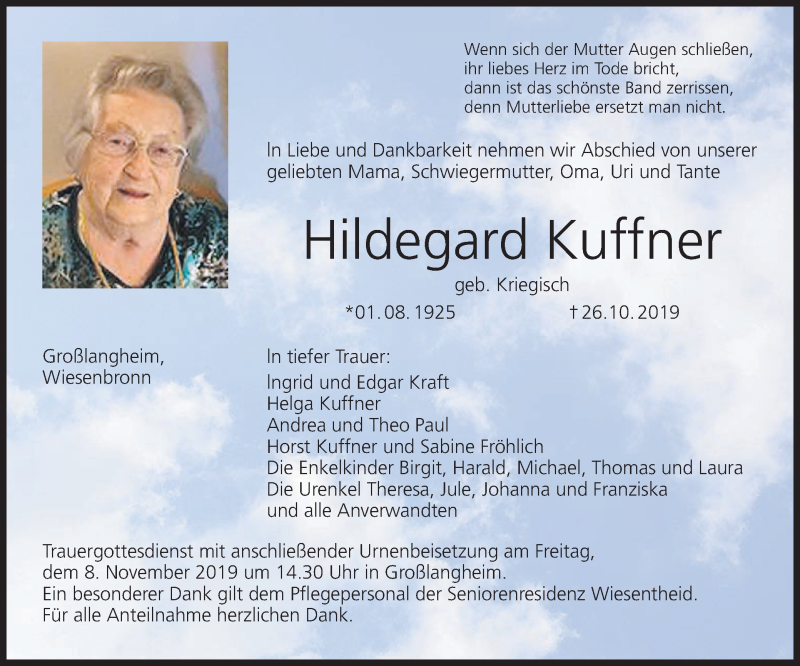 Hier finden Sie alle Traueranzeigen aus der Zeitung, die bisher für Hildegard Kuffner erschienen sind. Weitere Traueranzeigen, die in der Zeitung erscheinen, werden hier ebenfalls aufgelistet