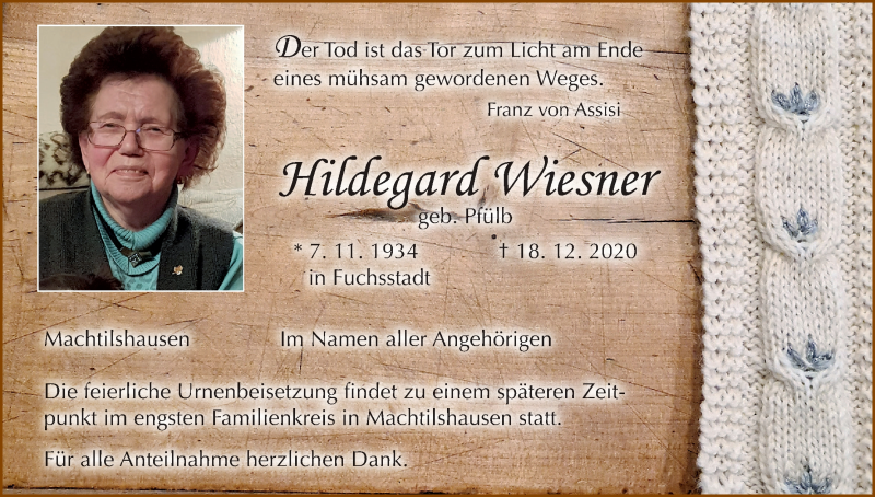 Hier finden Sie alle Traueranzeigen aus der Zeitung, die bisher für Hildegard Wiesner erschienen sind. Weitere Traueranzeigen, die in der Zeitung erscheinen, werden hier ebenfalls aufgelistet